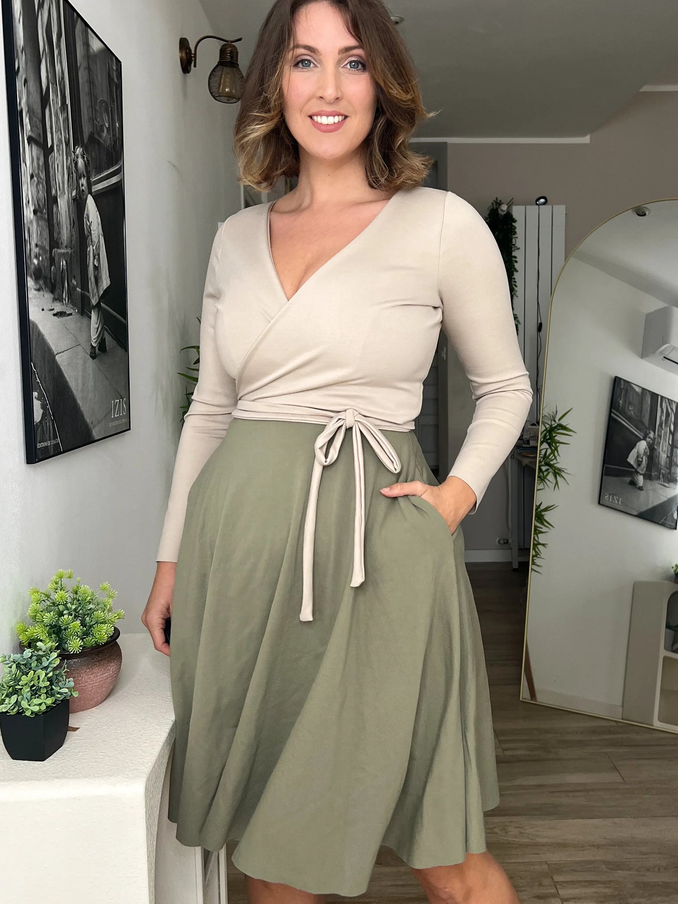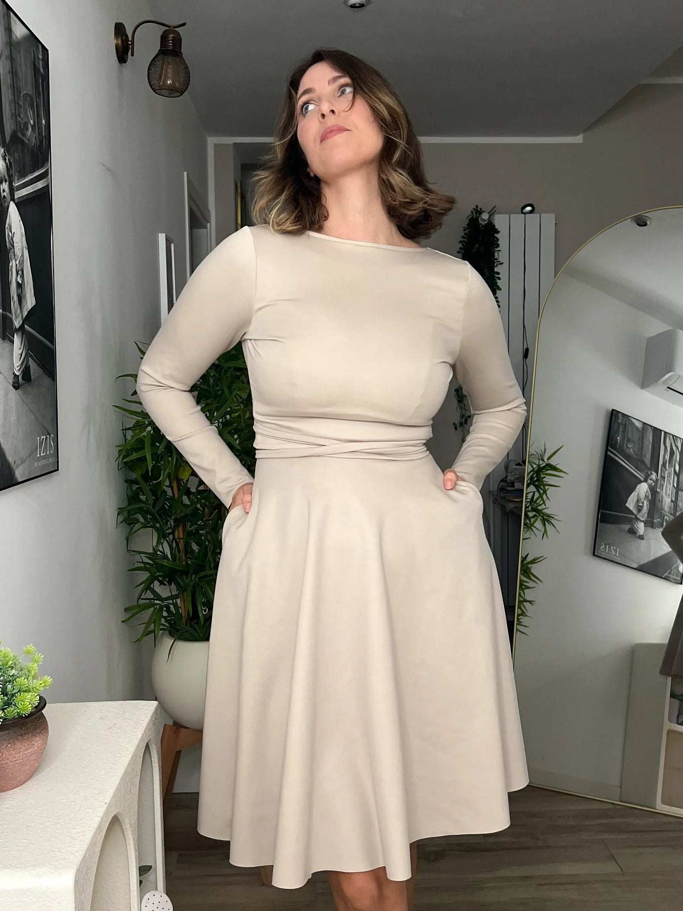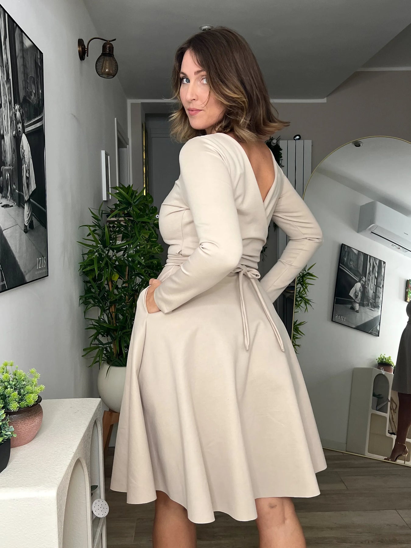 Il tessuto è morbido ma strutturato, avvolge il corpo come un abbraccio e accompagna ogni forma con armonia.